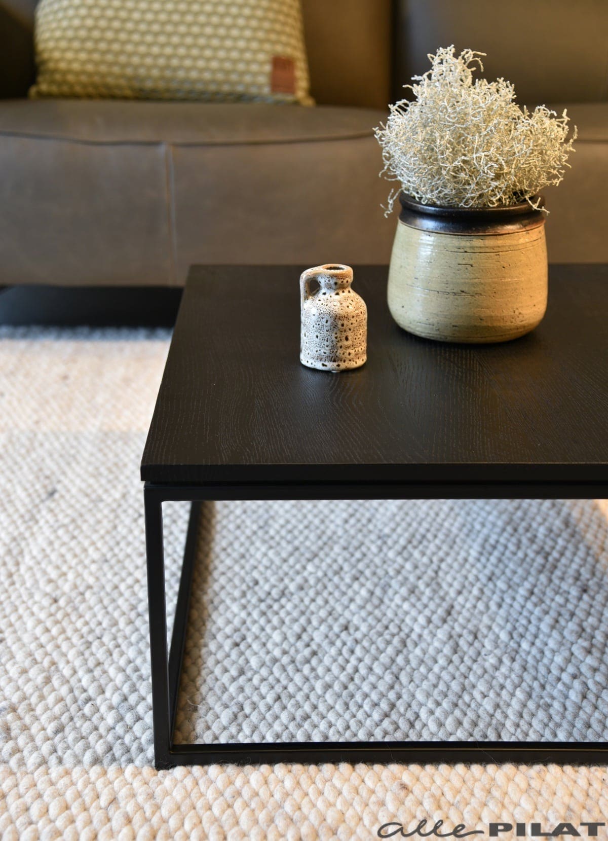 Salontafel Black is een vierkante salontafel, gemaakt van massief eikenhout op een zwart metalen frame. Een mooie strakke salontafel met een luchtig design, maar tegelijk ook stoer door de zwarte kleur. Het blad is niet door en door zwart waardoor de nerf van het eikenhout nog goed zichtbaar is. Dit geeft de salontafel een luxe en stijlvolle uitstraling.